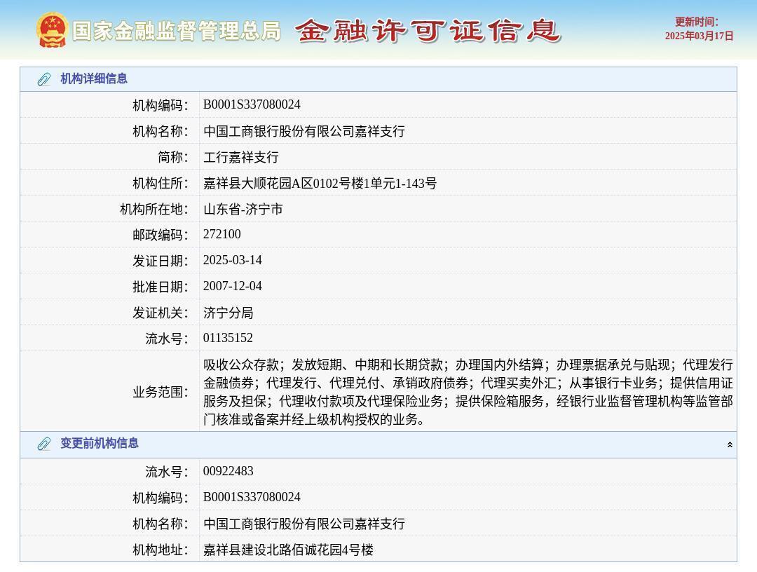 3月18日,根据国家金融监管总局许可证信息查询平台,中国工商银行股份有限公司嘉祥支行换发金融许可证,发证日期2025年3月14日。